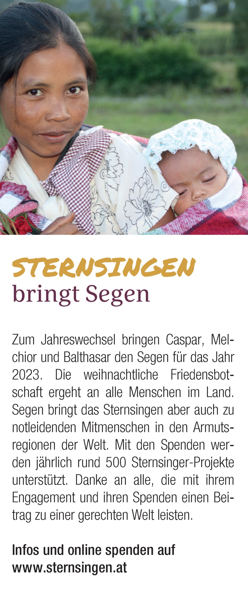 Ab 10 Uhr sind unsere Sternsinger und Sternsingerinnen unterwegs und bringen den Segen für das Jahr 2023 in Ihre Häuser und Ihre Wohnungen (so wie es vor Beginn der Coronapandemie gewesen ist). Die weihnachtliche Friedensbotschaft ergeht an alle Leute in Pottendorf und Landegg, an alle Menschen im Land.