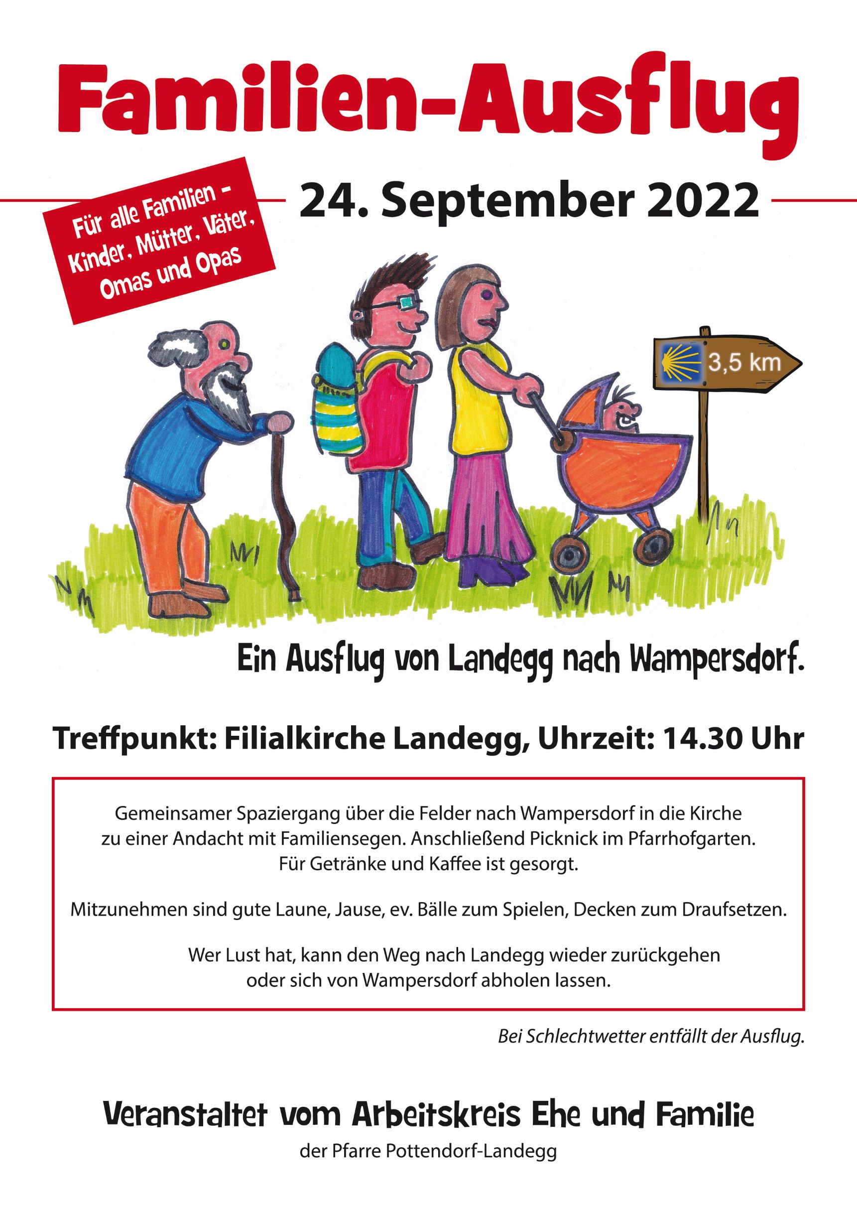 Wir treffen uns bei der Kirche in Landegg und gehen über die Felder nach Wampersdorf. Der Weg ist kinderwagentauglich.