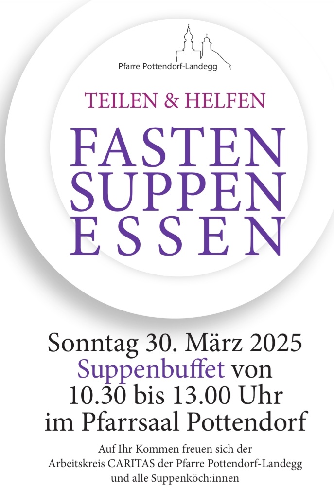 Der Arbeitskreis Caritas lädt herzlich zum Fastensuppenessen am 30. März in den Pfarrsaal Pottendorf ein.